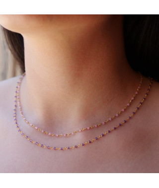 Notre produit phare, avec une chaîne fabriquée artisanalement avec enfilage de pierres naturelles et véritables, rondes ou facettées ! Collier réglable chaîne Inde. Base laiton doré à l'or fin 18 carats, 1 micron...