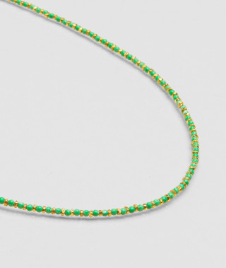 Collier Inde chaîne réglable. Base laiton doré à l'or fin 18 carats, 1 micron orné de perles facettées d'aqua calcédoine. Longueur maximum : 45 cm. Existe en différentes couleurs. Notre produit phare, avec une...
