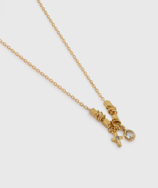 Le collier Gloria est une pièce pleine de charme et de détails. Une chaîne fine en laiton doré à l’or fin 18 carats (1 micron) qui accueille plusieurs pendentifs délicats : une petite médaille sertie de zircons...