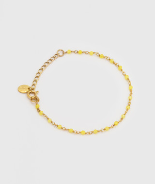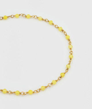 Le bracelet Inde Triple est un bijou raffiné et élégant, composé d'une chaîne maillon et de deux chaînes en rangs de pierres Aragonite jaune enfilées à la main, dorées à l'or fin 18 carats 1 micron. Le fermoir est un...