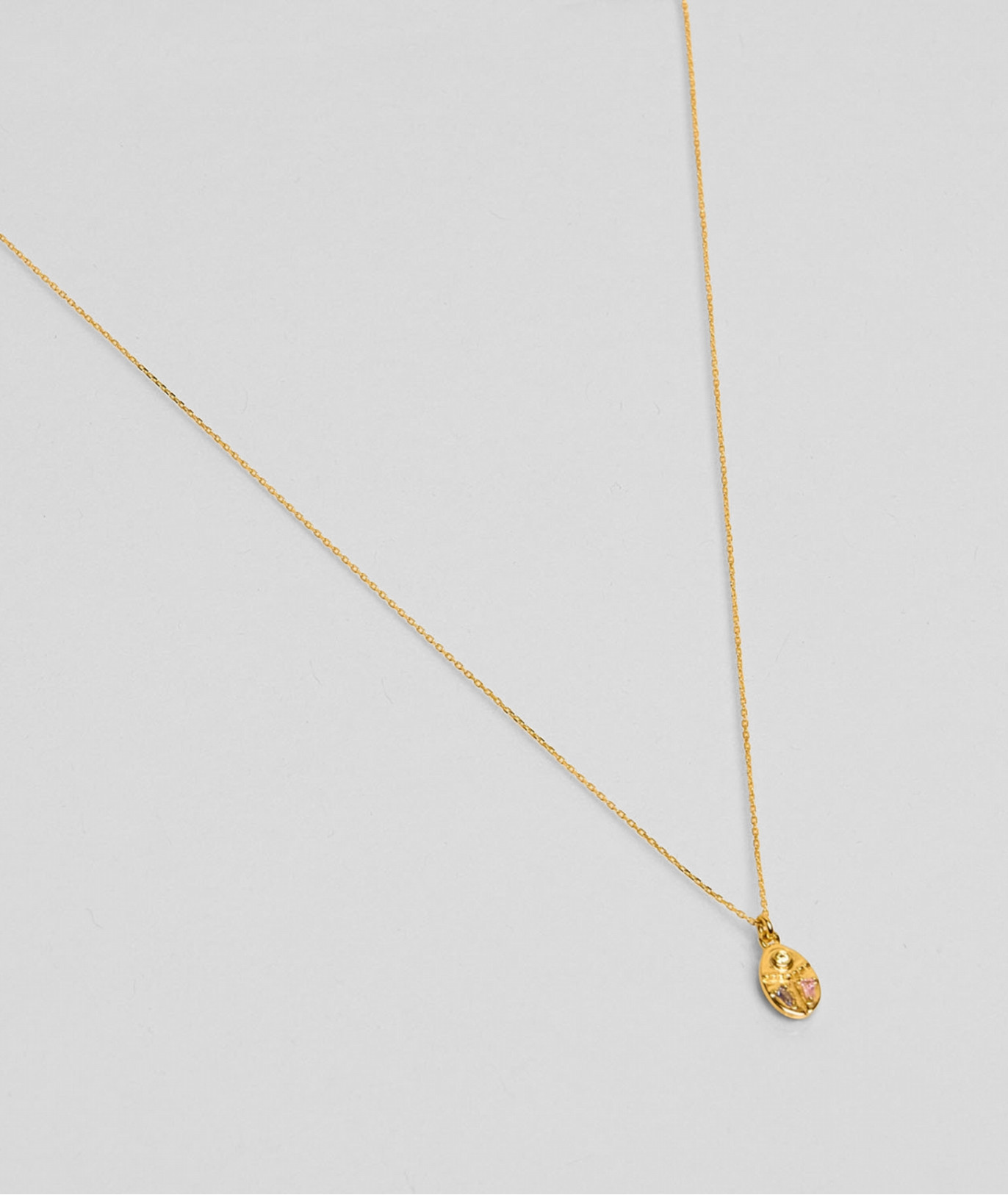 Le pendentif est orné d'un zircon de couleur citrine en haut, des zircons de couleurs multicolores au milieu et de 2 zircons baguettes en bas de couleur bleu foncé et rose pâle également.