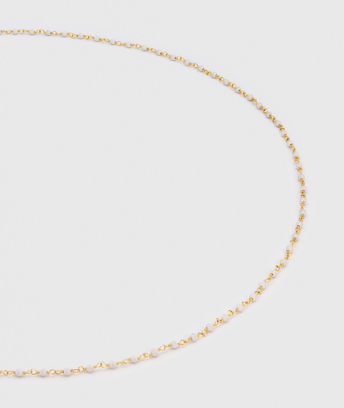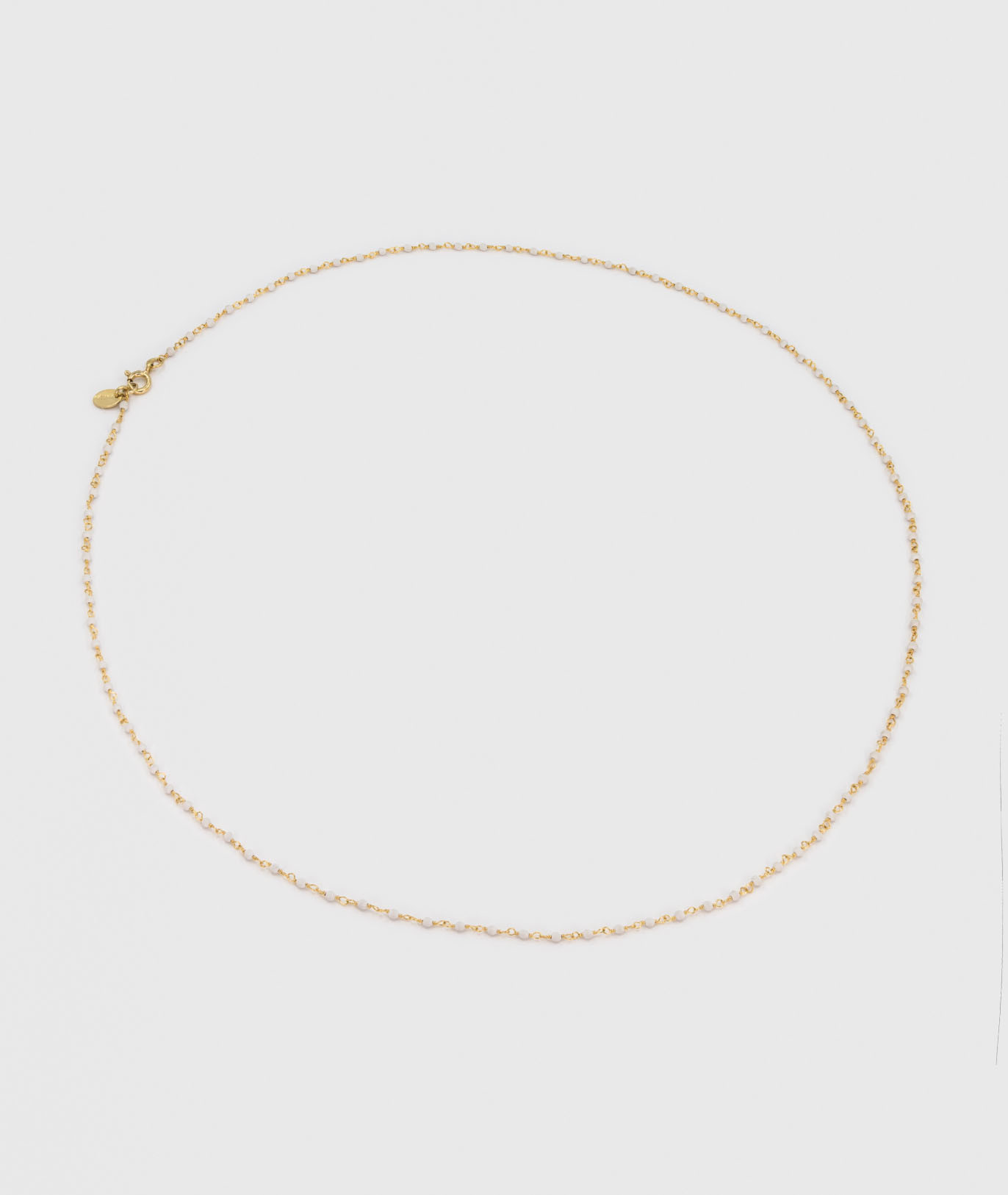 Le collier Inde est un bijou raffiné et élégant, composé d'une chaîne faite à la main en base laiton dorée à l'or fin 18 carats 1 micron et ornée de pierres semi-précieuses de lune blanche. Sa couleur nacrée se porte en toute saison et s'intègrera facilement à vos tenues au quotidien.