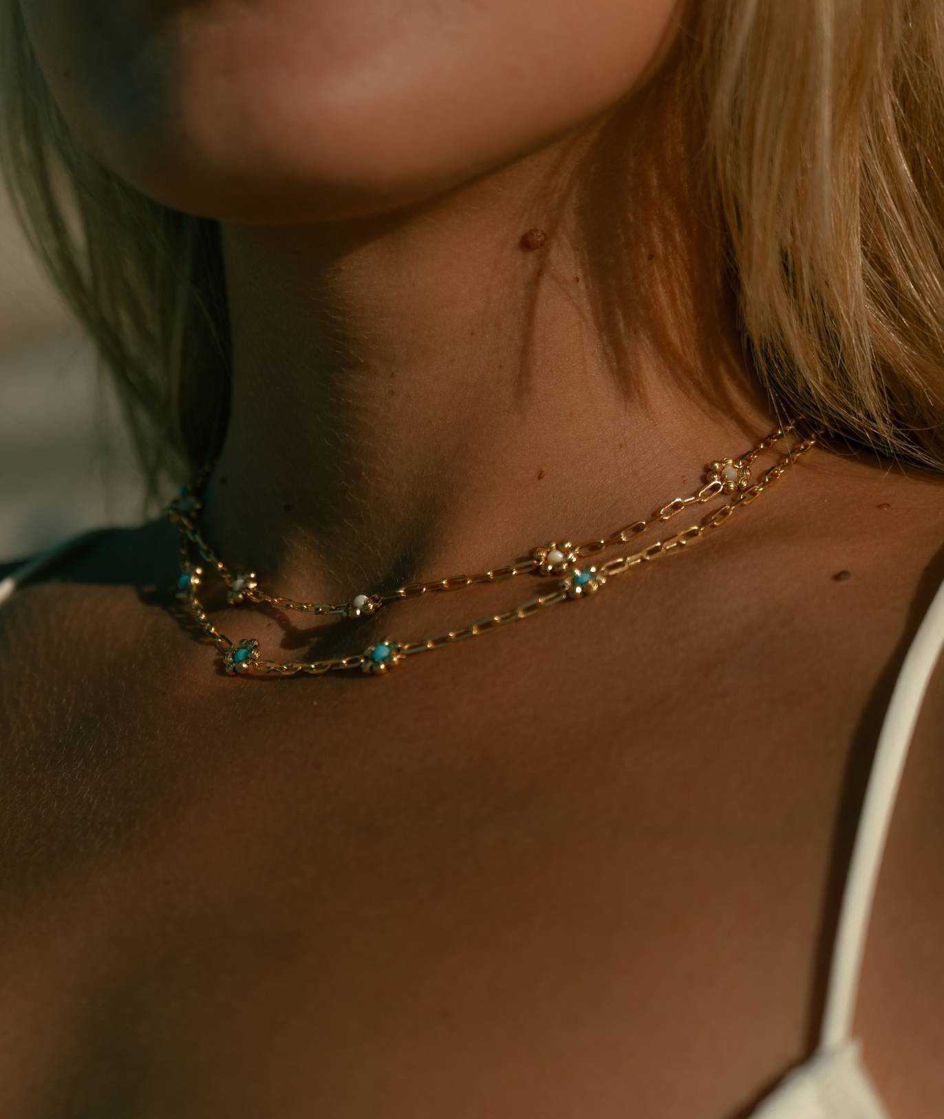 Le Collier Bloom Opale incarne la douceur et la féminité. Trois petites fleurs délicatement sculptées viennent ponctuer la chaîne dorée et révèlent en leur centre une opale aux reflets laiteux et irisés. L’opale capte la lumière avec subtilité : ses nuances nacrées varient selon l’éclairage, passant du blanc opalin à de légers reflets pastel. Cette pierre apporte une dimension presque poétique au bijou, tout en conservant une grande modernité grâce au contraste avec l’éclat doré.