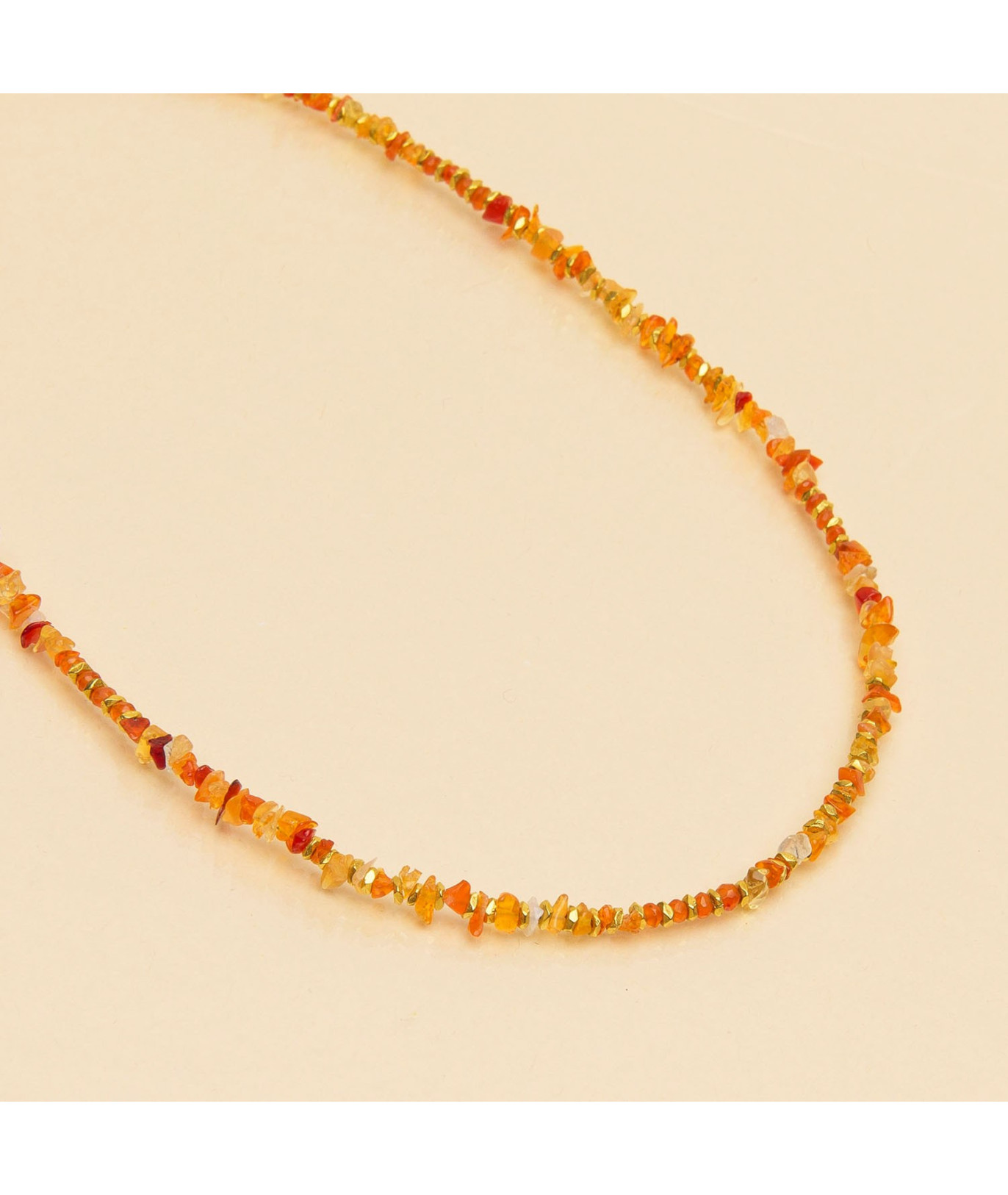 Collier Pacific, pierres de formes irrégulières en fire opal, alternées avec des écrous en base laiton doré à l’or fin 18 carats et des pierres cornaline.